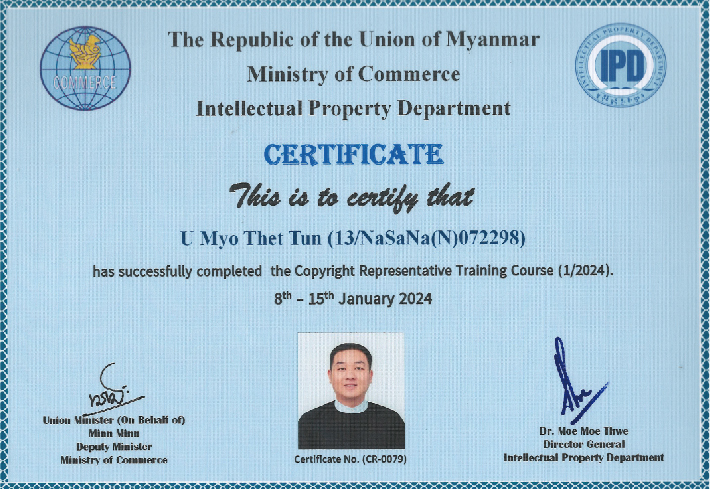 Attorney U Myo Thet Tun is a senior practicing lawyer (Advocate) with Myanmar nationality. He demonstrates a profound mastery of major laws and regulations in Myanmar, including but not limited to the Trademark Law, Company Law, Investment Law, Civil Law, and Contract Law. With extensive hands-on experience in the professional realm, he has been proficient in handling company registrations, applying for diverse project investment permits, managing various civil lawsuits, as well as handling trademark registrations.